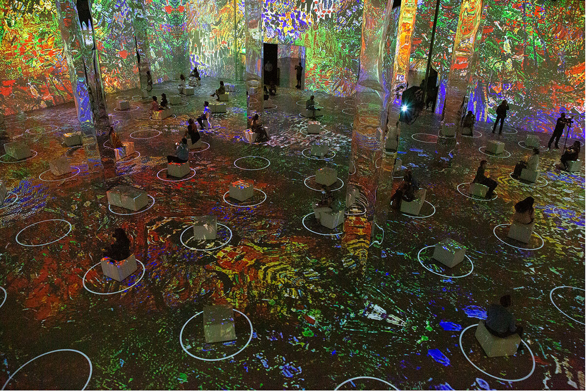 The main event is a floor-to-ceiling, wall-to-wall, surround showing of Van Gogh images produced from 64 projectors that run on a continuous loop. Visitors, themselves splashed with the images, sit on socially distanced cubes to watch a mashup of masterpieces, morphing from one to the next, in which crows fly, windmills turn, clouds shift, and irises grow.