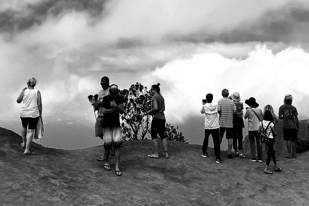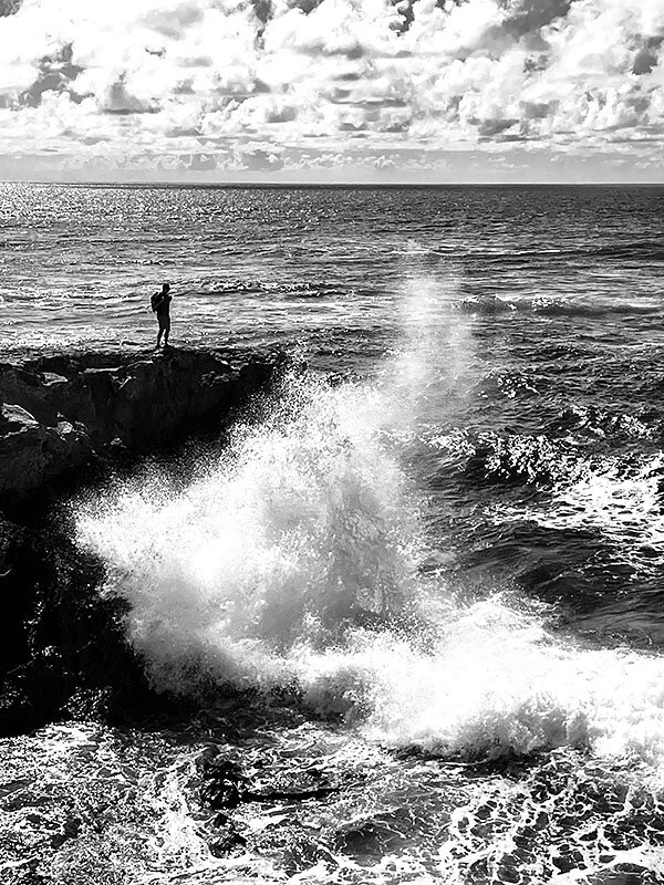 Or you might be hiking the coast of Kauai, say, when suddenly she indicates that it would be useful for you to stand across the way (she is pointing) on that promontory of crumbling lava above pounding surf. The waves, you observe, routinely shatter up and over said promontory.