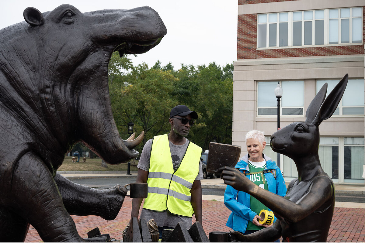 Navy Yard Garden & Art is hoping to implement programming that can help the community in additional ways, starting with food insecurity. In collaboration with the Harvest on the Vine food pantry, the organization used the opening event to collect food donations for the community. The sculptures The Hippo Was Hungry to Try New Things and The Wild Table of Love both feature different food items.