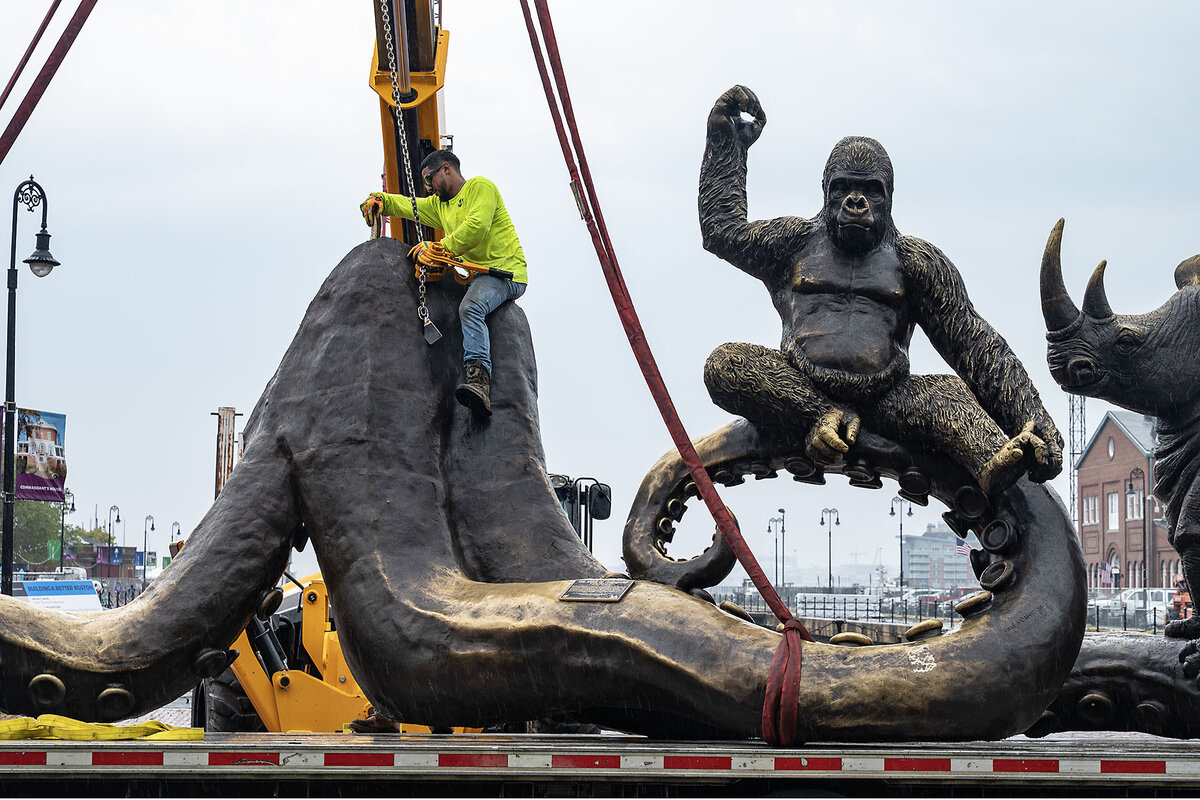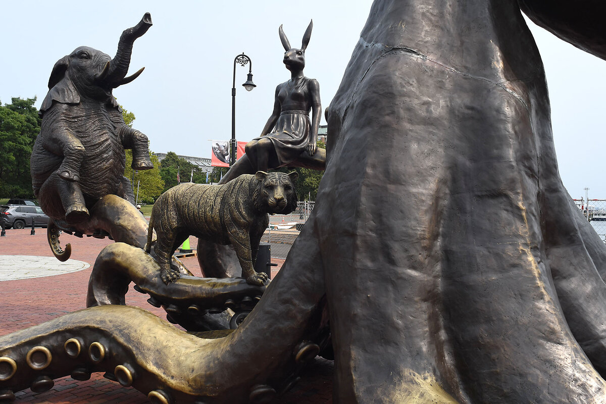 These sculptures are the newest residents of Charlestown – part of the exhibit – and they’ve already become minicelebrities. Everyone wants a picture with the 36-foot-long octopus and other bronze animals that found a new home tucked up against the highway and the harbor.