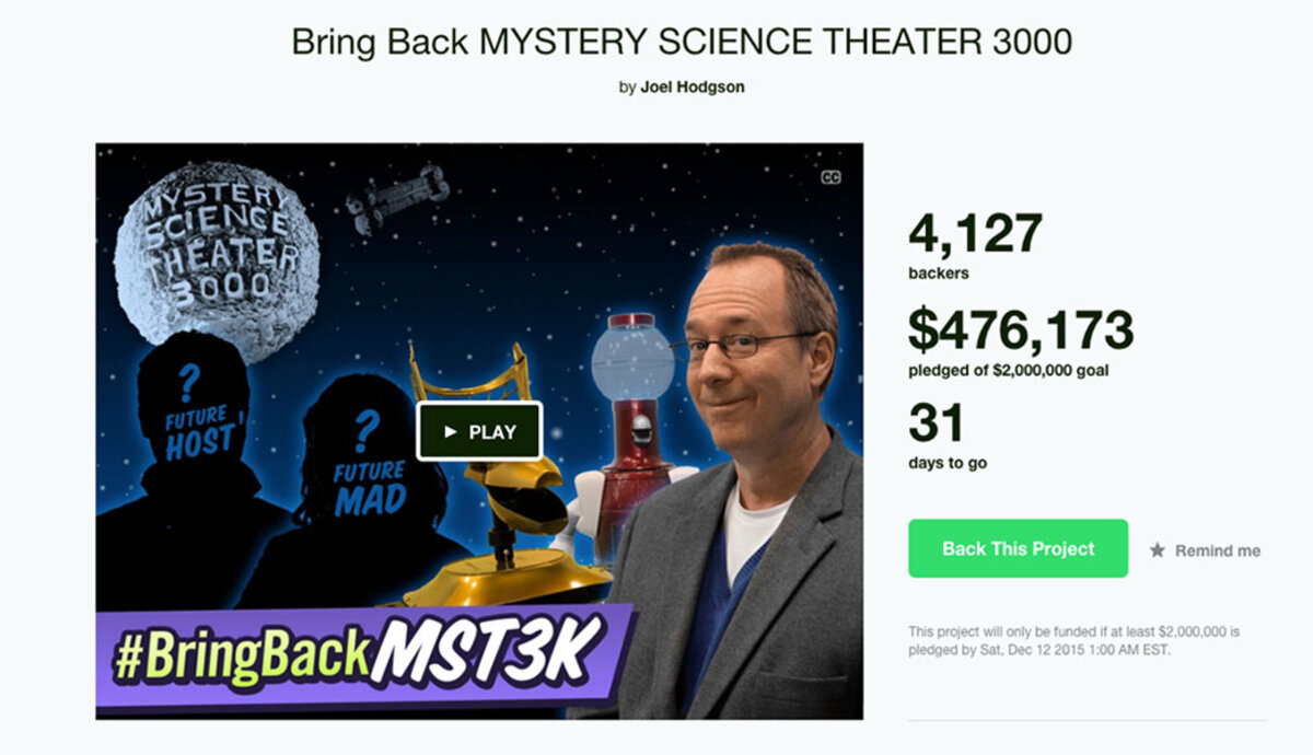 鈥淢ST3K鈥 creator Joel Hodgson has launched a Kickstarter crowdfunding campaign to bring back the show. The initial goal is to raise $2 million by Dec. 12, which would enable those behind the show to create three new episodes of the program. The ultimate goal, however, writes Mr. Hodgson on the Kickstarter page, is to raise $5.5 million to create a full season of 12 episodes.听