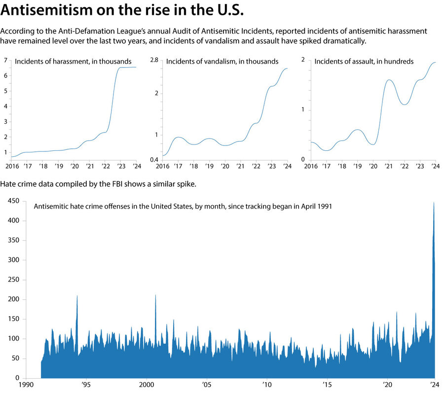 Antisemitism in the United States is surging to levels not seen in nearly half a century. A by the Anti-Defamation League (ADL) shows there was an average of 25 incidents per day over the last year – the highest since 1979, when the organization began tracking it.