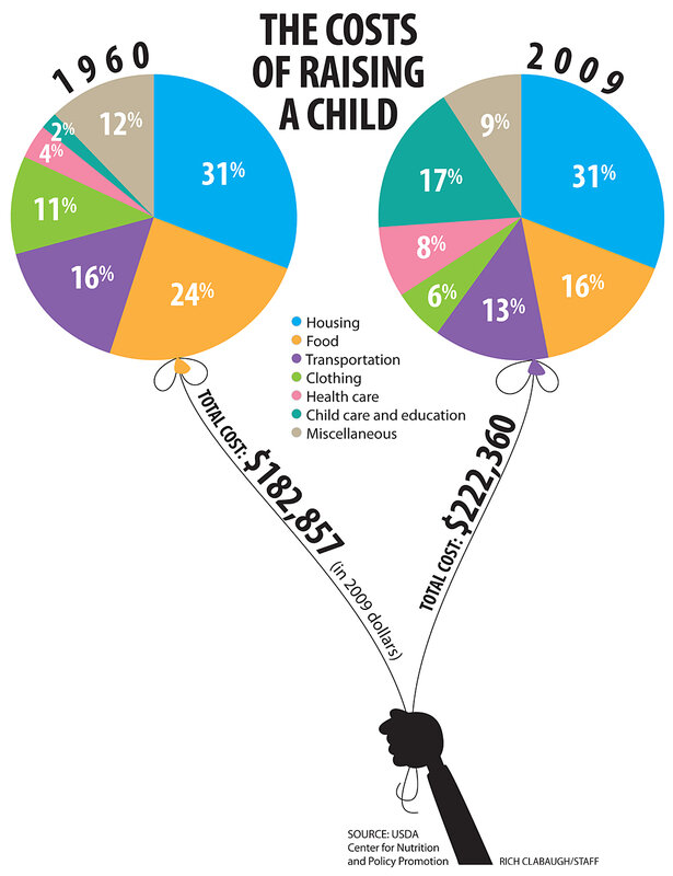 Everyone knows having children ups life's financial ante, and while parents may not figure it out to the dollar, the US Department of Agriculture does: By the time Alex turns 18, Mr. and Mrs. Giulianis will have spent somewhere around $222,360. That's the cost the USDA figures for the average middle-income couple raising a child from birth through age 17. And it's 22 percent more, in real dollars, than parents spent in 1960 鈥 in the thick of the baby boom 鈥 when the USDA started counting such things and when kids shared bedrooms, had one pair of shoes, ate TV dinners and Wonder bread sandwiches, did homework with encyclopedias, didn't go to the doctor 鈥 let alone medical specialists 鈥 for much more than vaccinations or a broken arm, and went out to play unsupervised. ("Just be home by dinner!" called stay-at-home moms who did their own housekeeping but no helicoptering).