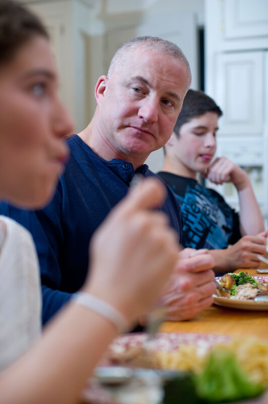 As pork chops are passed, the meal takes on a kind of generic dinnertime feel. Wrapped in happy chatter are encouragements and admonishments, mini rebellions and micro corrections, gibes, jokes, banter, and barbs. In this house, you don't have to finish all the food on your plate; but you do have to wear your shirt, take off your hat, mind your manners. Everybody shares the same food. The day's events are replayed, and clarifications sought.