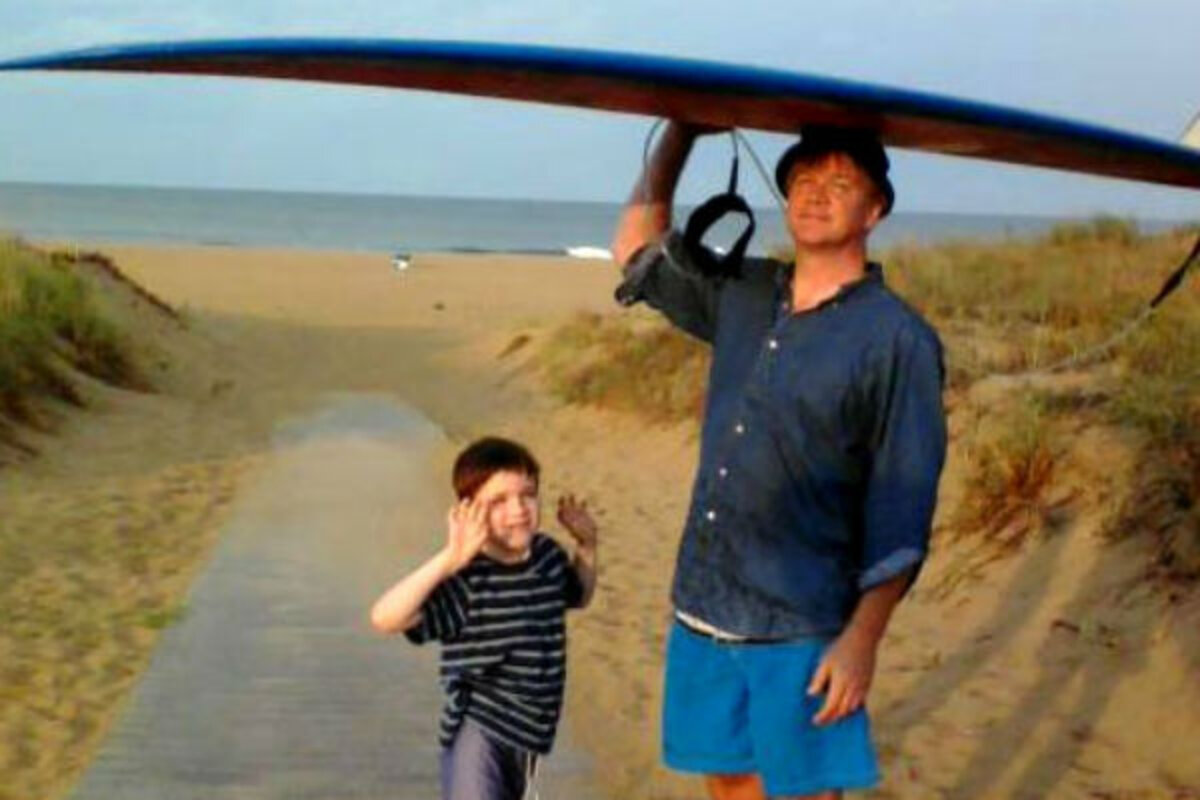 Of course he has his moments that are worthy of a sitcom. An example might be putting a timid autism spectrum eight-year-old who just learned how to swim out in the ocean, tethered via his little ankle to a 鈥渟upertanker鈥 Dewy Weber surfboard and launching him onto a wave without a life jacket, alone!