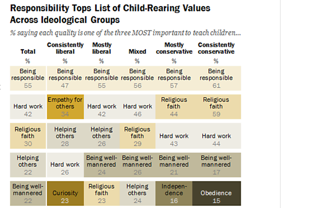 Beyond these three values, the conservative-liberal divide begins to assert itself when it comes to child-rearing values.