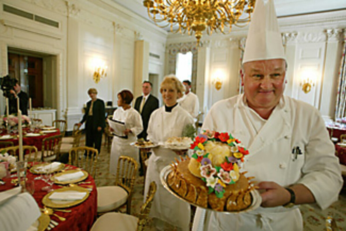 "I will not say how I'd feel about a Hillary Clinton presidency, he replied. And by the way, I never worked for a Democrat or a Republican. I worked for the president of the United States." But Mesnier does say that it was during the fatiguing Clinton years when he began to think about retirement. "They liked to entertain big, with a capital B," he says, explaining that he had been used to making cakes, pies, pastries, and petits fours for parties of about 150, but the Clintons' guest list would often number 600 and once it even swelled to 6,000. Mesnier, who had only one full-time assistant, was working around the clock and saw little of his wife and son. The idea of retirement became more appealing than ever before.