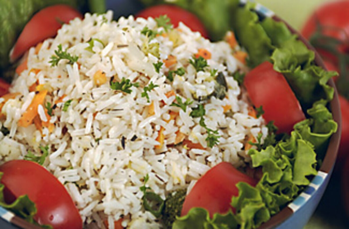 Use white, brown, wild, or a combination of rice. When finished cooking the rice (see article above for instructions), add salad dressing to the rice while still warm, then stir in vegetables. Chill for several hours, but for best flavor, serve at room temperature. Serves 6 to 8.