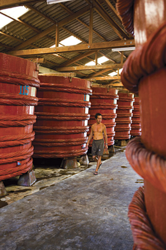 鈥淎nchovies or salmon are best, but you can use pretty much any fish [in making the sauce],鈥 explained the tour guide. 鈥淲e collect ours from the port or market as soon as the fishermen dock every morning. The fast option is to put fish into cylindrical 30-ton-capacity wooden tanks at a ratio of 10 [parts] fish to 4 [parts] salt, or 3 [parts] fish to 1 [of] salt,鈥 he continued. 鈥淩unoff from the fish is removed through a hole in the bottom of the tank, and put through the tank again and again. Within five days, we can take the first fish sauce.鈥