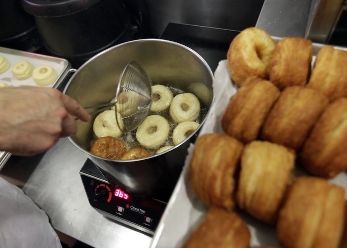 After that you鈥檒l be heating grapeseed oil in a large pot to 350 degrees and fervently checking it with your deep-frying thermometer because if it's too low, the pastries will be greasy; too high, the inside will be undercooked while the outside is burnt. So just fry those up, fill with ganache, pipe with fondant, and voila: an At-Home Cronut.