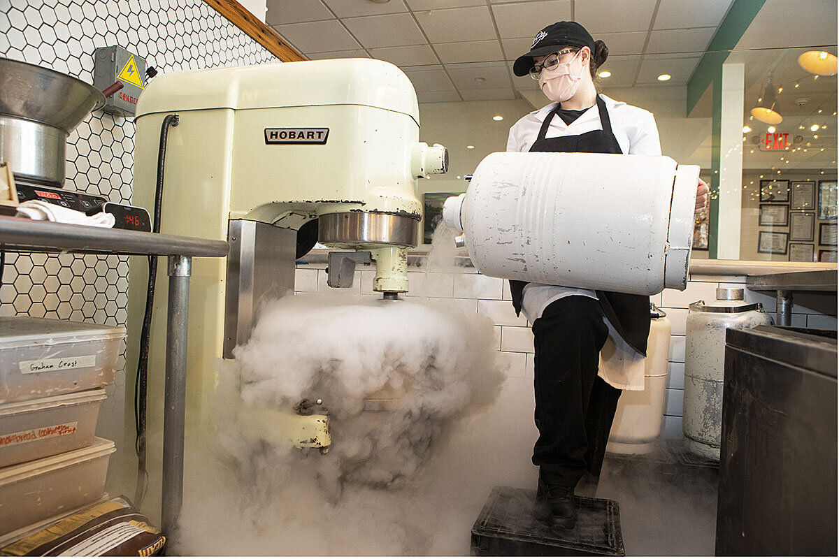 The open kitchen of New City Microcreamery looks as if it鈥檚 on fire. On the other side of the ice-cream serving counter, a white vapor begins to billow like smoke. Six children dash over to investigate. A chef is pouring a canister of liquid nitrogen into a massive mixing bowl. As soon as the clear liquid mixes with the base, it creates a white fog that floods the kitchen. It looks like dry ice at a rock concert.聽