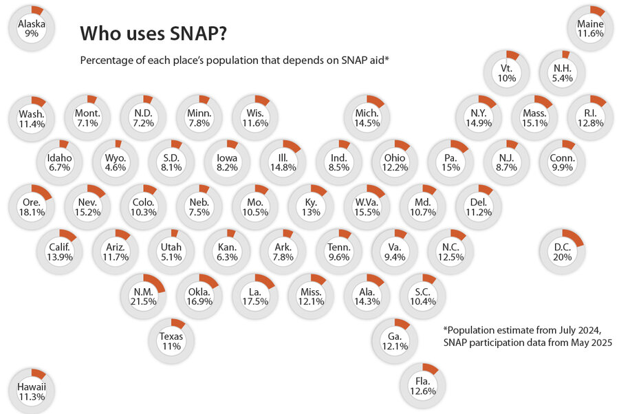 New Mexico is the state with the largest proportion of its population using SNAP 鈥 more than 1 in 5 residents 鈥 followed by Louisiana and Oregon. The states with the most SNAP recipients are California (about 5.4 million people), Texas (nearly 3.2 million), and Florida (almost 3 million), the Center on Budget and Policy Priorities.