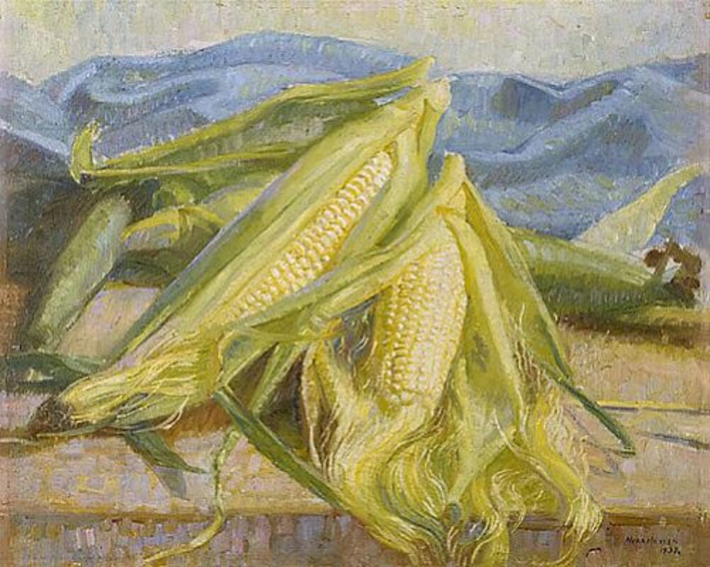 painted Corn cobs the same year she won the prestigous Archibald Prize. As the first woman appointed an official war artist, she travelled to New Guinea in 1943 where she was stationed for three years and completed 170 works depicting the women鈥檚 war effort. Corn cobs demonstrates influences of art, which would have viewed during her European travels, apparent through the thick handling of the paint and short, visible brushstrokes. She particularly admired the art by but it was , the artist featured in my , who informed her earlier still life aesthetic.
