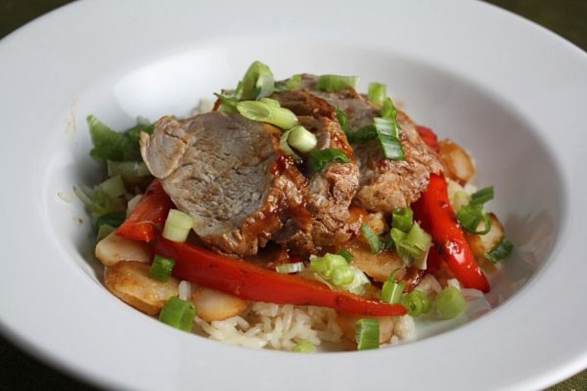 But recently, Mother Nature gave us one, last kind-weather reprieve with a handful of beautiful, sunny, and warm days. Not to let this gift go to waste, the boys and I spent a little time romping in the leaf covered yard. On days such as these, a simple no-fuss dinner is in order. And I鈥檝e got just the thing; a simple hoisin-glazed pork tenderloin served over rice with sweet roasted peppers and crunchy water chestnuts. The ingredient list is short, the preparation uncomplicated, and the result delicious.