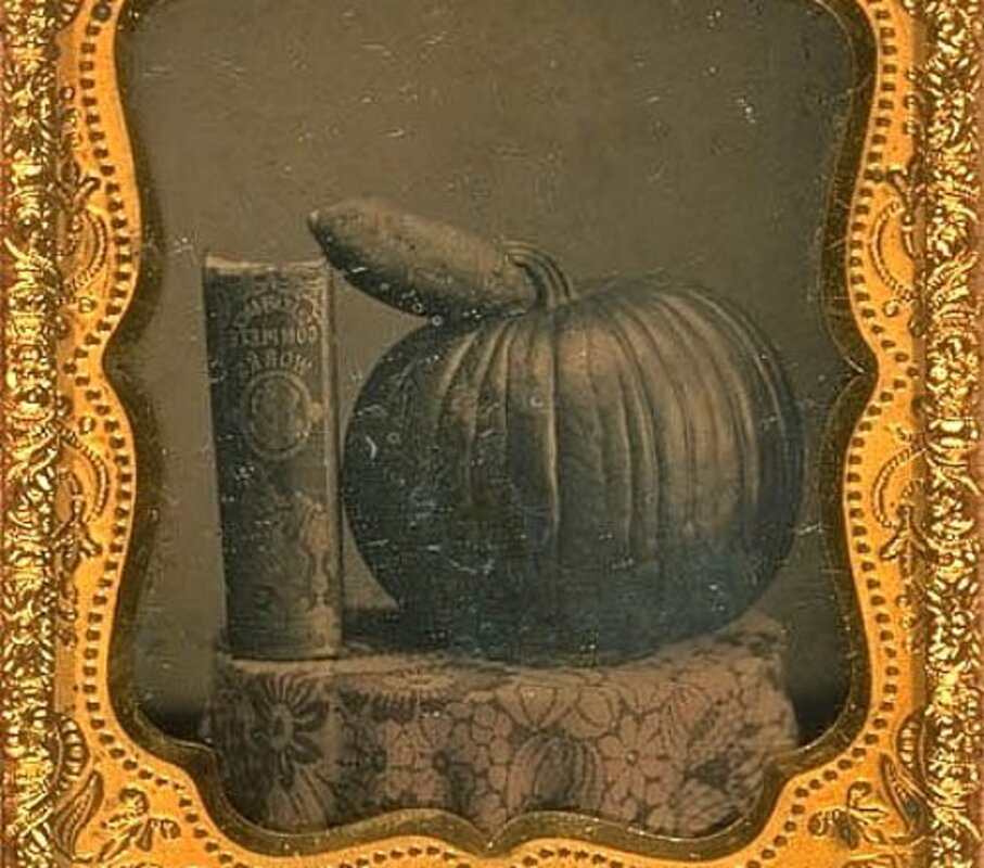 The still life has had an important role within the history of photography since the inception of the medium in the mid-19th century. As the technology advanced, still life compositions were the simplest works to produce because the inanimate objects gave the artist the greatest amount of control during the long exposure time. With further inventions that shortened the required length of exposure, photographers were able to explore other genres in an attempt to propel the medium forward within the visual arts. In the 1850s, when Still Life with Pumpkin, Book, and Sweet Potato was shot, photography was gaining importance and was often included in major exhibitions. A daguerreotype is made by heating mercury to develop a copper plate, coated with a thin layer of silver that was exposed to sensitized light with iodine vapor to form crystals on the plate. The process creates a unique image that is mounted in a sealed case to prevent oxidization. Because the entire operation was so labour intensive, the process was quickly abandoned in favor of the ambrotype and tintype technique.