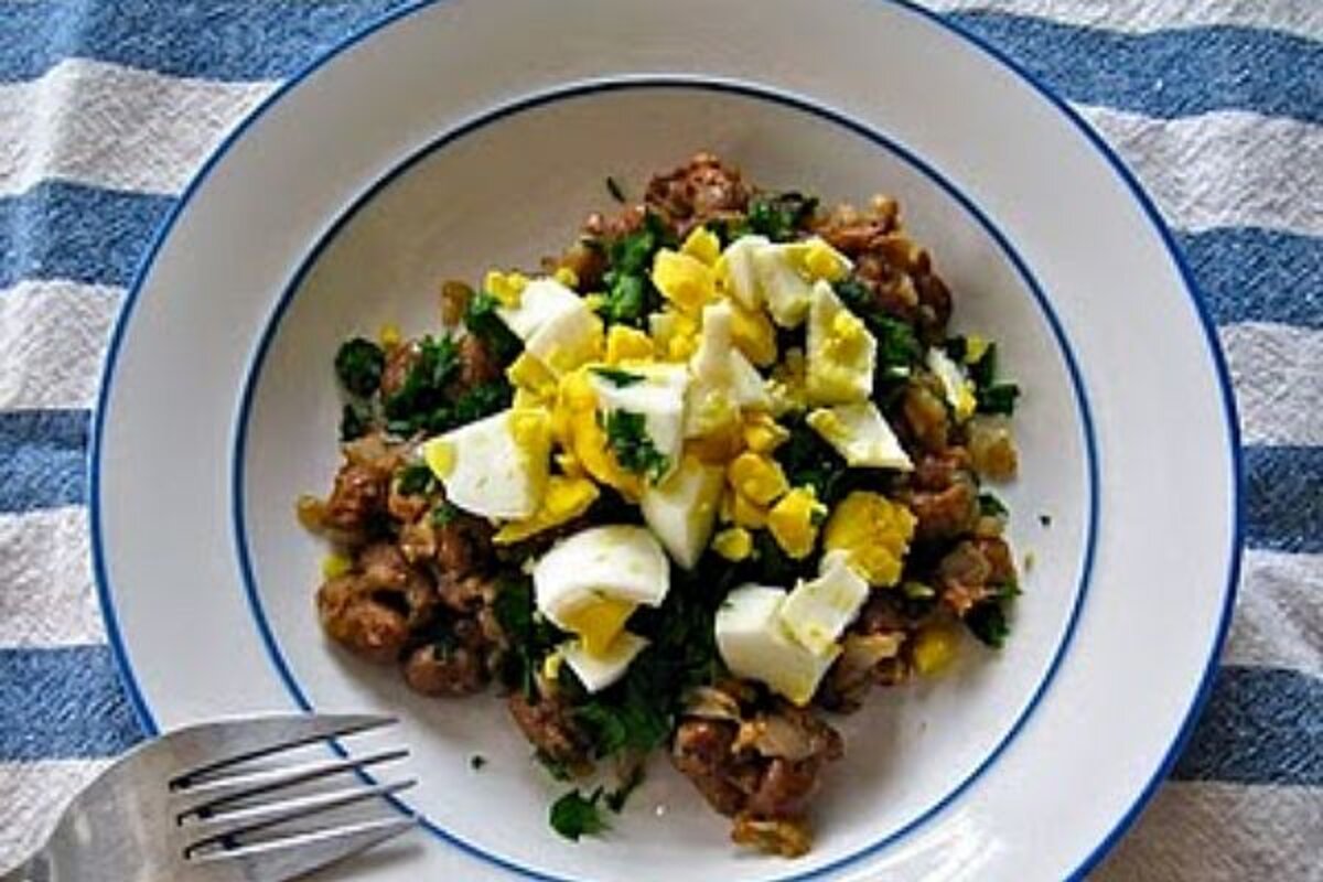 Serve with lemon wedges, hard-boiled egg, and parsley and a drizzle of olive oil on top.