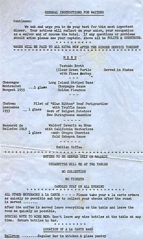 Type-written on thin white paper and folded in half, General Instructions for Waiters provides a rare glimpse from the other side of the swinging door. And while the instructions (see image) don't reveal anything juicy or even anything terribly interesting (politeness and courtesy are emphasized, cigarettes will be at the tables, candles stay on all night), finding a menu from a worker's point-of-view is unusual, especially for such a high-profile dinner. I also like to imagine how these instructions came to the Library. Did a waiter keep a menu as a souvenir, tucking the memo inside? Who thought to preserve such an ephemeral document? Whoever it was, I'm glad he/she did; these are the very types of items libraries treasure, as they offer evidence of an event largely, if not completely, undocumented elsewhere. These instructions provide us with more of a complete story of the event 鈥 not just that the Queen ate green turtle soup, but that it was a served in plates with fines herbes 鈥 and it reminds us of those who shuttle in and out of the dining room all night, carrying filet of beef , savarin au rhum, and butter 鈥 but only on request, of course.