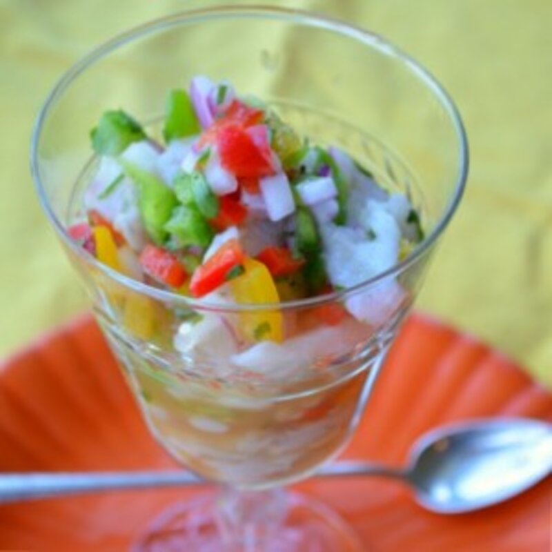 Mix orange, lime and lemon juice and pour over fish or scallops in a glass bowl; Add peppers, jalapeno, onion, and cilantro; toss to coat. Season generously with salt and pepper; let stand until opaque, about 30 minutes. Taste, adjust seasonings, including additional salt, if necessary. Serve.