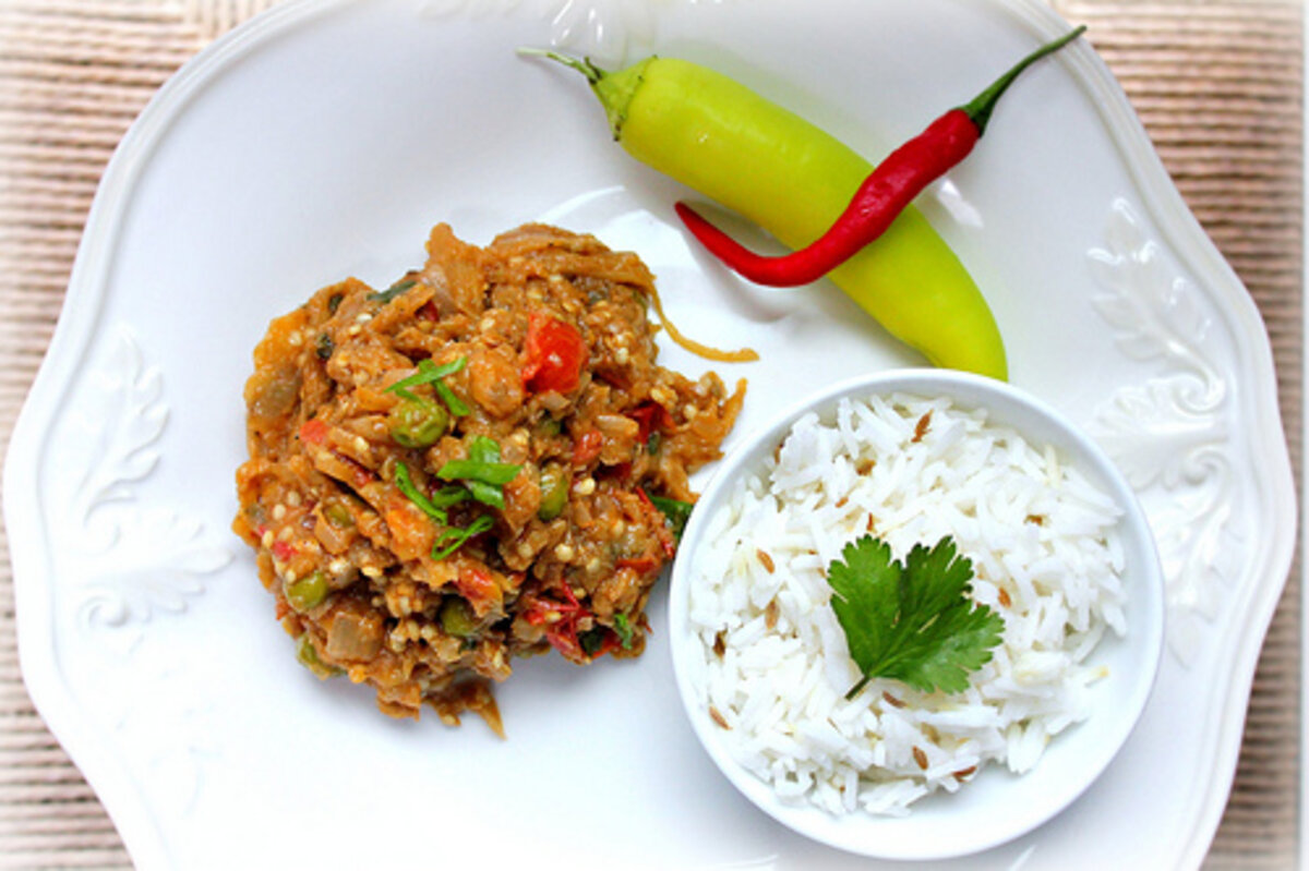 First eaten at our neighborhood Indian restaurant, , this roasted eggplant and fragrantly-spiced sauce is typical of the Punjab. Best known these days among Westerners for the inimitable musical stylings of , the Punjab is a region of densely-populated river valleys now shared between India and Pakistan but with a historical relationship with the Persian (Farsi)-speaking, Islamic peoples of to the north and east in Afghanistan and Iran. In fact, Punjab (Panjab in Farsi) means 鈥渇ive rivers鈥, and it is in this relationship to the natives and co-religionists of the Middle East that the dish鈥檚 roots lie.