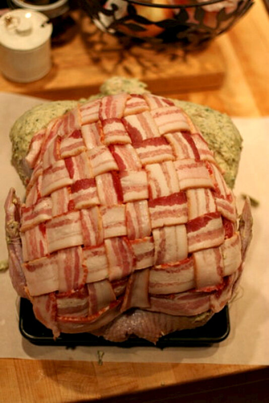 Now we work on the flavor and added juiciness. I tinkered with this recipe for many years, until I hit on just the right method. I have always rubbed butter on roasted chicken or turkey, or covered it in bacon to keep the bird moist. For a big mama gobbler, I double down.