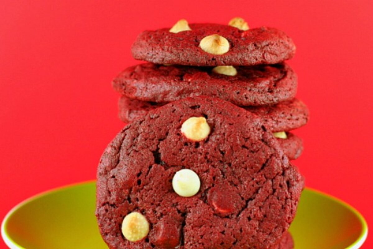 In a small bowl, use a fork to mix together the flour, cocoa powder, baking soda and salt. Use the fork to break up lumps of cocoa powder. Add the dry ingredients to the butter in the mixer a little at a time, mixing well after each addition and occasionally scraping down the sides of the bowl. When the dough is thoroughly mixed, add the food coloring, beating until the dough is a dark red color. If you have some place important to be or just had a manicure, I鈥檇 recommend wearing gloves. That red food coloring will show up in the oddest places. When the dough is evenly colored, stir in all but about 1/2 cup of the white chocolate chips until mixed in.