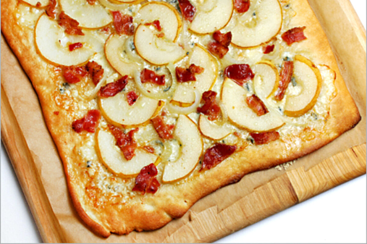 The Intertubes thought so, too. Search pear cheese pizza on Google and you鈥檒l get roughly a bazillion results. Many of them, however, take you in a dessert or vaguely sweet appetizer direction, some calling for sugar, brown sugar and even cinnamon. I wanted to go savory with this. And I wanted it to be a serious meal. So I started with blue cheese, a sharp, salty, big-personality cheese. You could also use Gouda, goat cheese or even the pizza classic, mozzarella, but I think blue cheese plays well against the sweetness of the pear. I added onion to further separate this pizza from the dessert course. And as a final big hit of savory/umami, I added bacon. If you want to go vegetarian, you can skip the bacon, but I think it really anchored this pizza as main course fare.