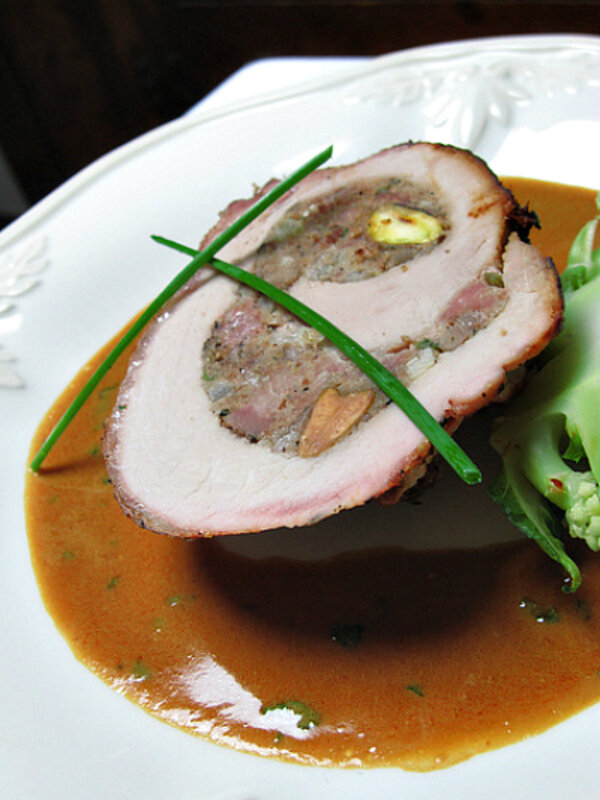 Pork roast roulade with sausage, pistachio, and chestnuts with cider gravy