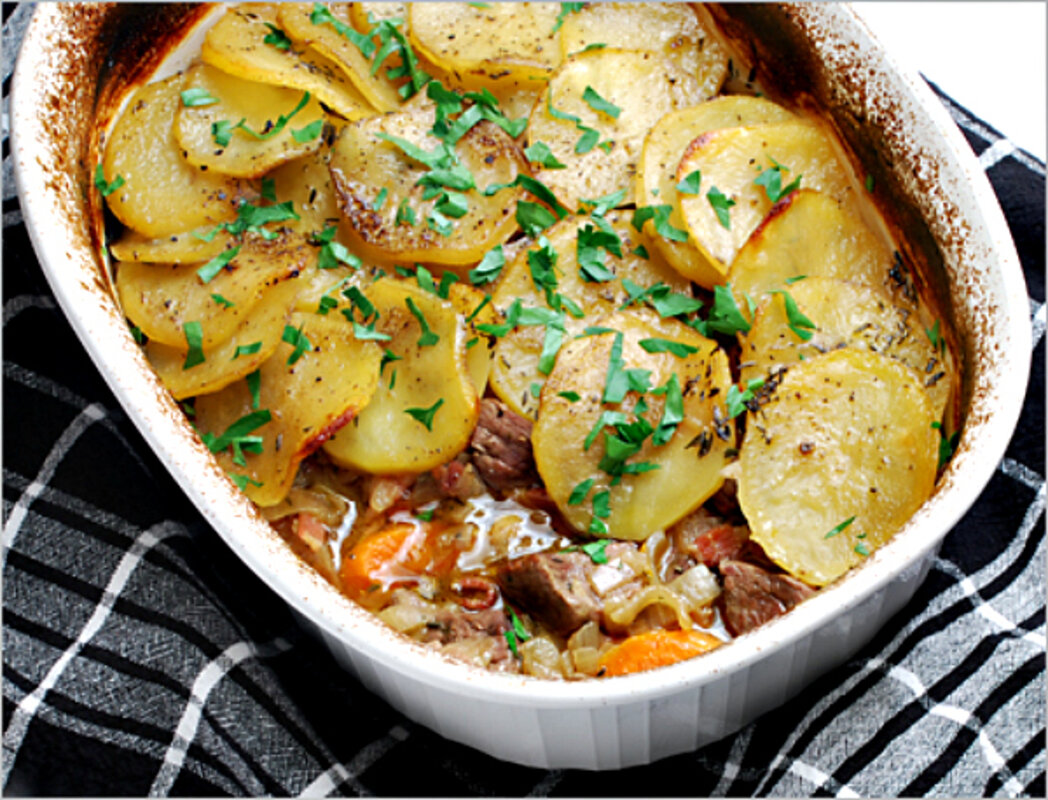 Preheat the oven to 350 degrees F. Peel the potatoes and slice them into rounds, 1/8 to 1/4-inch thick. Place in a bowl of cold water and set aside. Season lamb with salt and pepper and brown in a large skillet with 2 tablespoons of oil over medium-high heat, 6 to 8 minutes. Don鈥檛 crowd the lamb; brown in batches, if necessary. Using a slotted spoon, transfer lamb to a bowl.