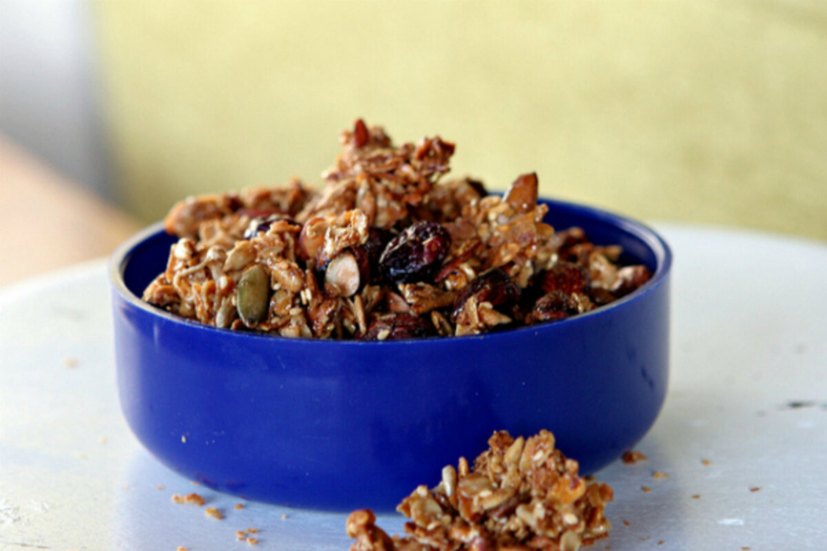 And my kitchen always has a jar of granola in it. The kind I'm into lately is made with brown rice syrup, which makes it unbelievably clustered and shiny. Almost shellacked. This is the olive oil granola recipe I've been into for the last 18 months, just a bit different. Another health goal of mine is "Automate my breakfast." A jar of this makes that easy to do.