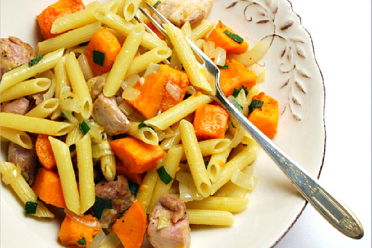 I had neither the patience to make little pasta pillows nor a hankering for something from the 鈥渞egion of dessert.鈥 But pasta sounded like a good idea. Adding onion and garlic to the mix would take the sweet potato in a savory direction. And a little chicken would make it a meal. If you鈥檇 like to make a vegetarian version, just skip the chicken and add a generous amount of freshly grated Parmesan cheese at the end.