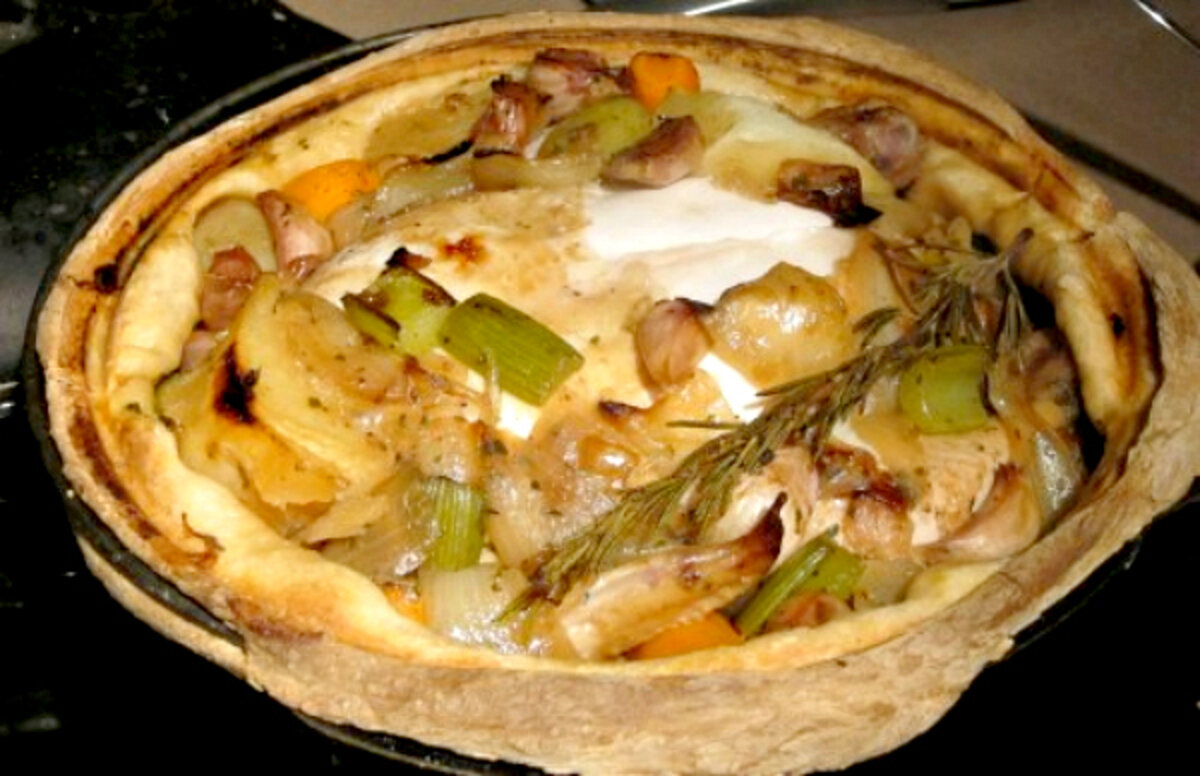 This whole braised chicken makes a good dinner party dish, but is also just right for a long winter afternoon when you have nothing special planned. The dough seal keeps the steam inside the pot, gently braising the chicken to an amazing degree of tenderness. The potatoes, carrots, and celery are traditional accompaniments for a Sunday roast, but here they are infused with the aroma of herbs and garlic. And there is plenty of garlic, but it is not overpowering, as the whole cloves cook in their skins and become sweet and caramelized. Serve with French bread, so that you can pop the garlic cloves out of their jackets and smear them all over the bread.