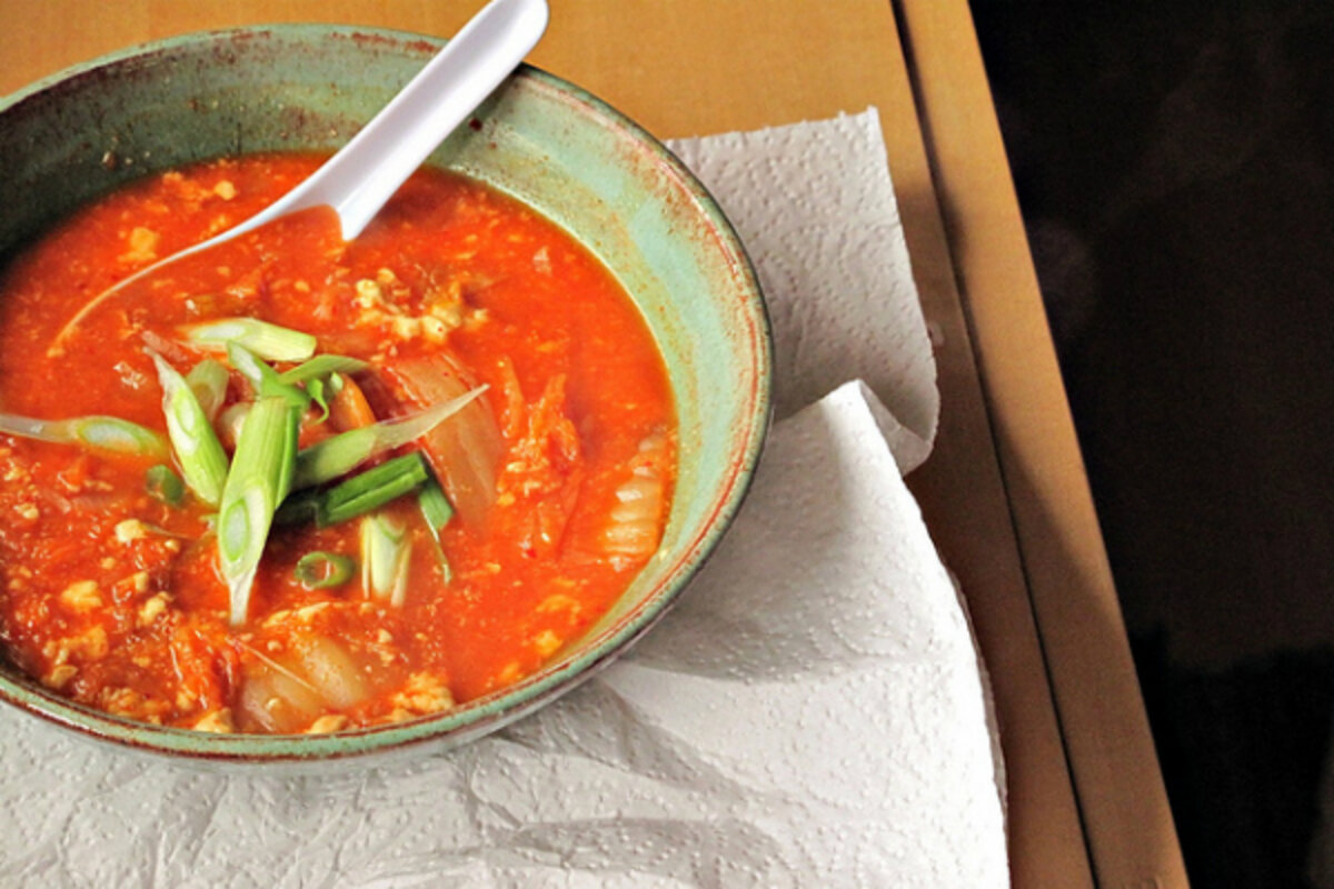 This is a classic Korean soup, and there are more complicated and caloric ways to make it. It's often made with pork belly (yum!), but the point for me is usually to have something quick and healthy. I can make it for myself in 10 minutes for a working lunch at home. It takes that long to make a sandwich, for gracious sake.