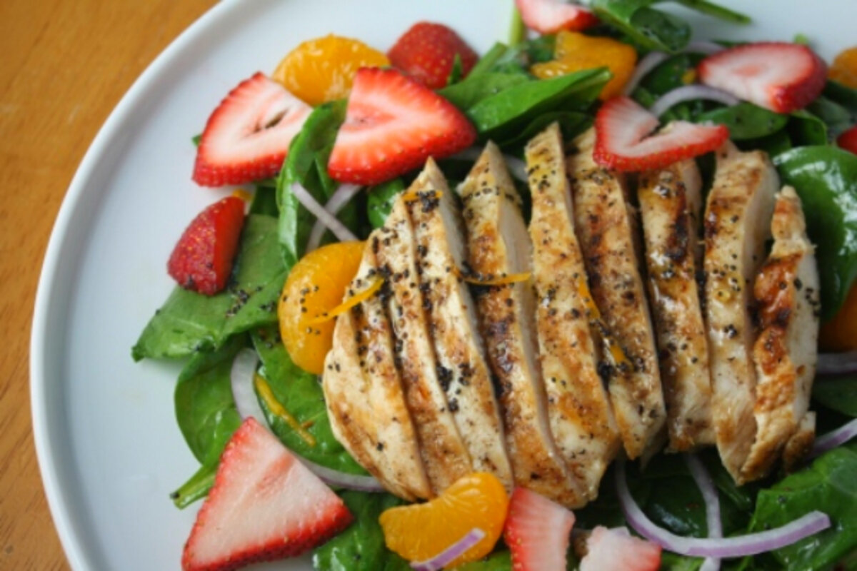 Grilled Chicken, Strawberry, and Spinach Salad in an Orange Poppy Vinaigrette