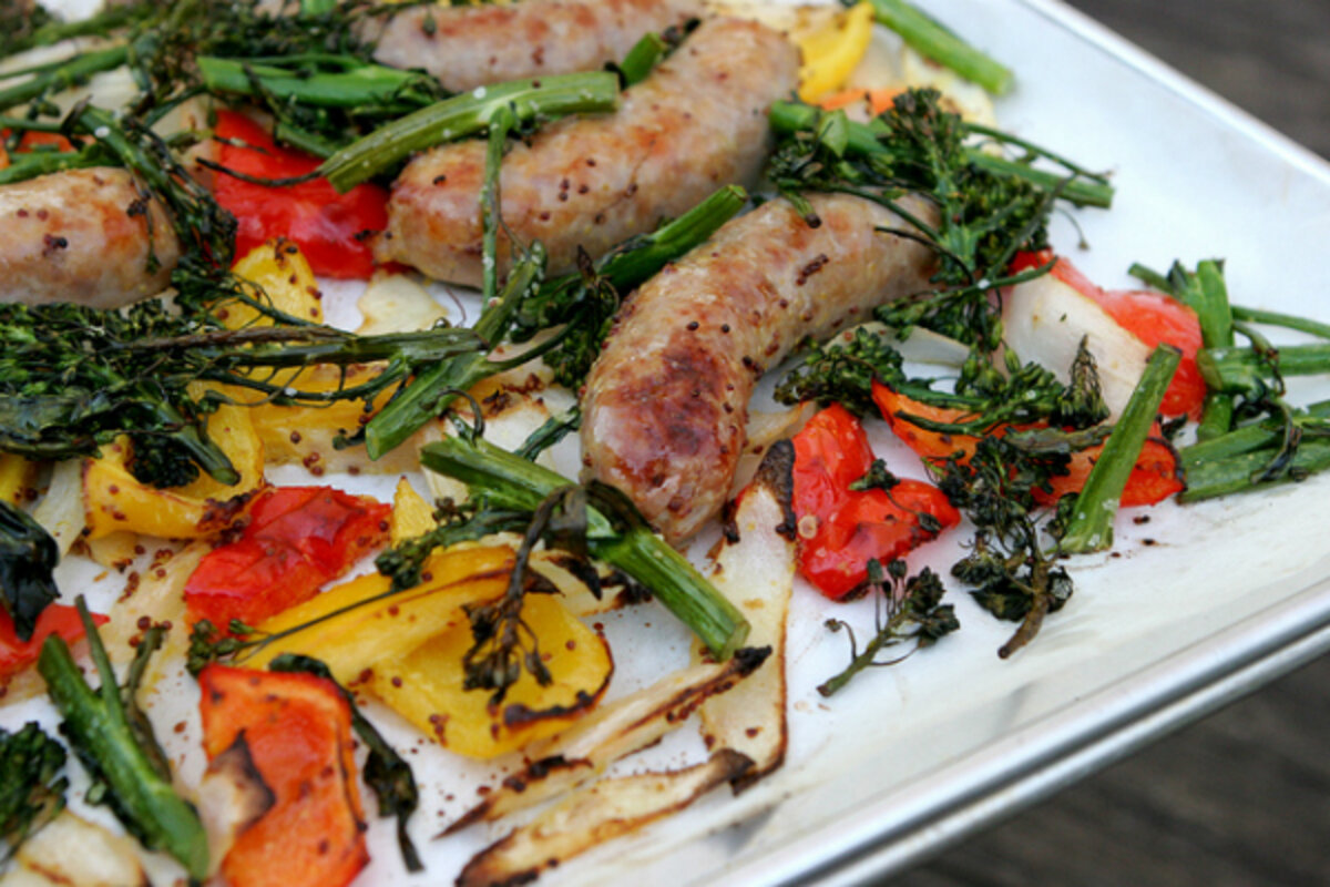 In a large bowl, combine the sausages听with the peppers,听onion, olive oil, coarse salt, dijon听mustard, and citrus. Toss with your hands.听Spread evenly听on your baking sheet and roast for 10 minutes.