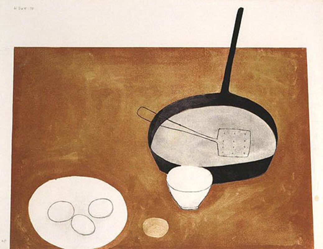 After a period of more traditional representation in the 1950s, Scott returned to increasingly abstract compositions from the 1960s onwards. The pots and pans were paired with other geometric forms, layered on flattened backgrounds. In the print above, the eggs and plate are the same shape and color and are only differentiated by size.