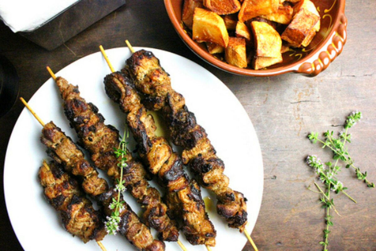 Dryness is a frequent problem with grilled pork, even if it has been afforded a lengthy bath in an olive oil based marinade. Grilled lamb doesn鈥檛 usually have this problem due to its higher fat content, but the flare-ups that dripping grease provokes can give the meat an acrid, bitter taste. Seeking to mitigate both these problems, we traded the typical pork shoulder chunks for strips of luscious pork belly, and the grill for a ridged griddle pan. We also used soaked bamboo skewers instead of metal ones to add even more moisture to the equation. The result: moist, delicious meat with the crispy edges synonymous with grilled food but without the burnt flavor.
