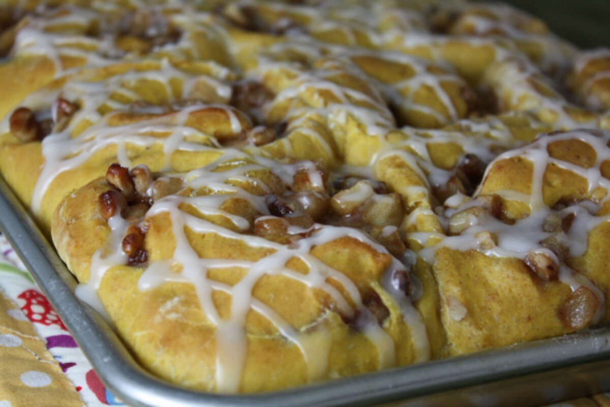 I鈥檇 originally planned on making apple cinnamon buns. Then, I ran across a recipe for聽聽and the idea of an聽autumn harvest bun聽came to mind. I made a few adaptations to the pumpkin bun recipe, then whipped up a little apple, pear, and walnut filling; similar to a thickened pie filling. Next, I rolled the sweet pumpkin dough with the apple, pear, and walnut filling, baked them, and drizzled the whole batch with a sugary glaze.