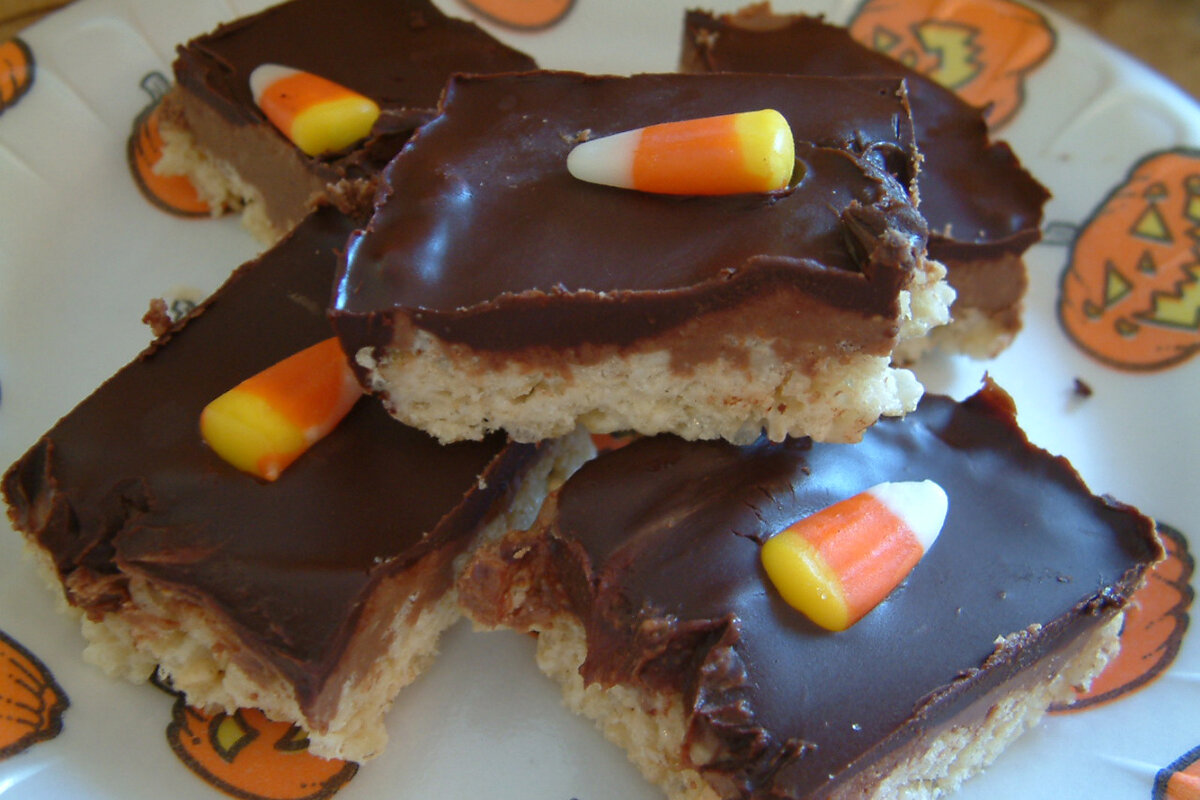 Candy corn, peanut butter and chocolate, and Rice Krispie treats all say 鈥Halloween.鈥 So why not combine them all into one decadent treat? A crunchy, gooey crust under a creamy milk chocolate-peanut butter layer and topped with a dark chocolate ganache and a candy corn gem.