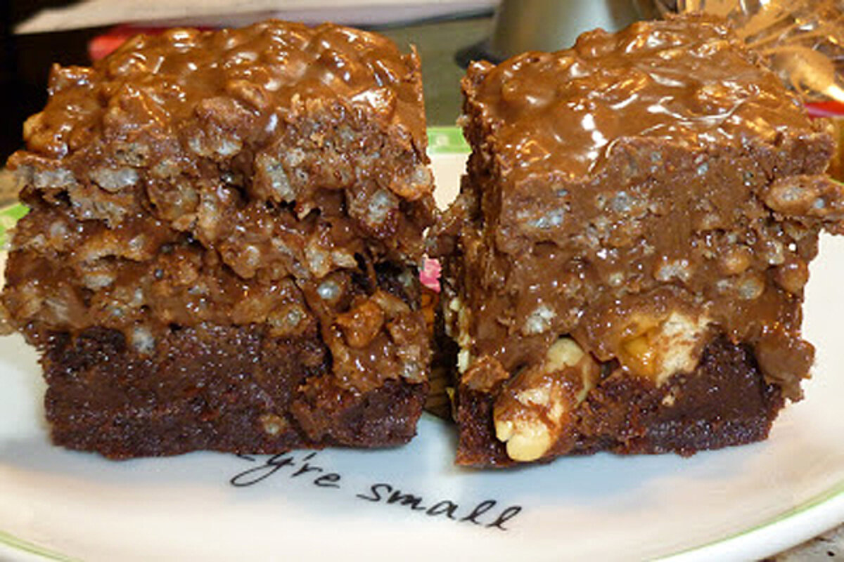 6. While the brownies聽are finishing up in the oven,聽melt the chocolate chips, peanut butter and butter in a medium saucepan over medium-low heat. Stir in the Rice Krispies until evenly coated. Remove the brownies from the oven and pour the chocolate and peanut butter mixture over top. Spread to cover evenly. Refrigerate for 2 hours before cutting into 24 squares. Share.