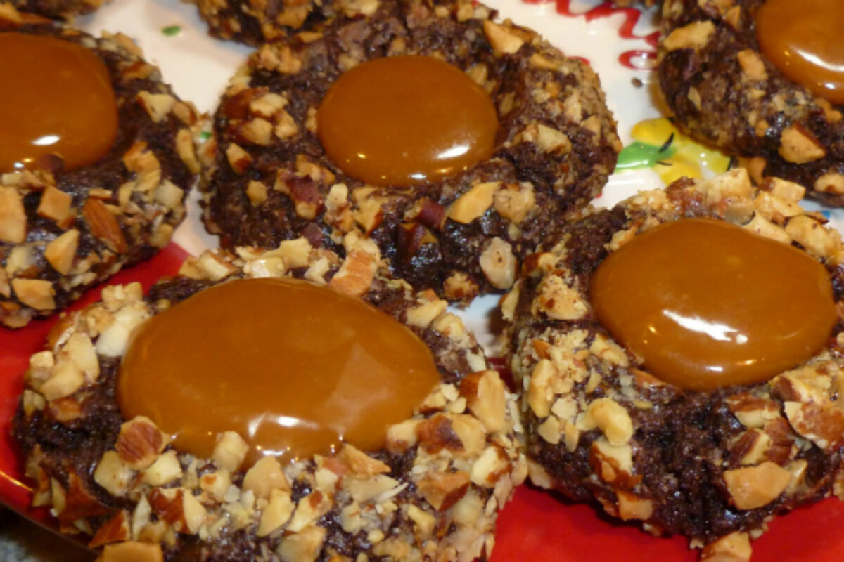 I love "thumbprint" cookies for holiday parties.聽 They're cute, little, and tasty. I was already making Peanut Butter Chocolate Kiss Cookies for my dessert party so I went with this as a different cookie option. Instead of Hershey Kisses in the middle of the cookie, this held a well of caramel. Caramel, chocolate, and toasted almonds (or pecans) 鈥 you can't really go wrong with this combination. I made the dough ahead of time and completed the steps of rolling the cookie dough balls in the egg white and chopped nuts then making the well in the center.聽 After that I put them in freezer bags and stashed them in the freezer until baking time. 聽