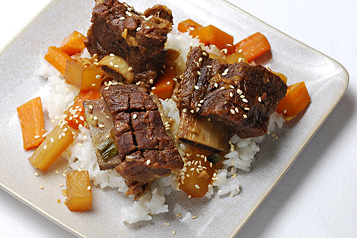 Plate cooked rice in individual shallow bowls or rimmed plates. Top with ribs and vegetables and spoon sauce over. Sprinkle with toasted sesame seeds and serve.
