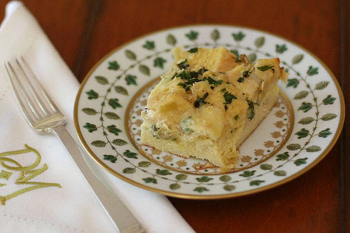 3. Trim the rind off the brie, removing as much of the white rind as possible without sacrificing too much cheese. I find a long serrated knife works best, and the cheese needs to be very cold and firm. Cut the brie into small pieces. Grease a 9- by 13-inch baking dish. Spread the bread in the dish. Spread the leeks out over the bread, tucking them in between the cubes and distributing them evenly. Distribute the brie pieces throughout the bread and leeks, tucking them down between the cubes of bread and leeks.
