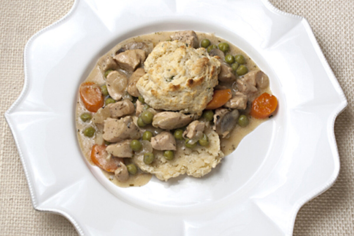 The drop biscuits are in keeping with the rustic roots of pot pies and are far easier to make than rolled biscuits. You can prepare the filling a day or more ahead and gently reheat it while you make the biscuits. Or you can get the filling started on the stovetop and then make the biscuits as it simmers.