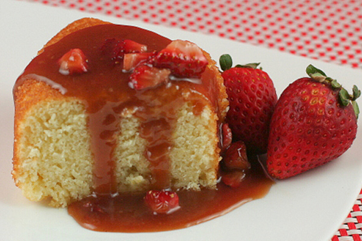 I planned this post to highlight the cake, and how useful it is. But I wanted to try something a little more interesting than just fruit so I stumbled around in the kitchen until I came up with the sauce. I know it is tooting my own horn, but it is a stunner. Rich, sticky caramel sauce with this amazing background note of strawberry and the added bonus of chunks of fresh berries. It is magnificent with the cake, but try it over ice cream, or, as I admit to doing, simply with a spoon.