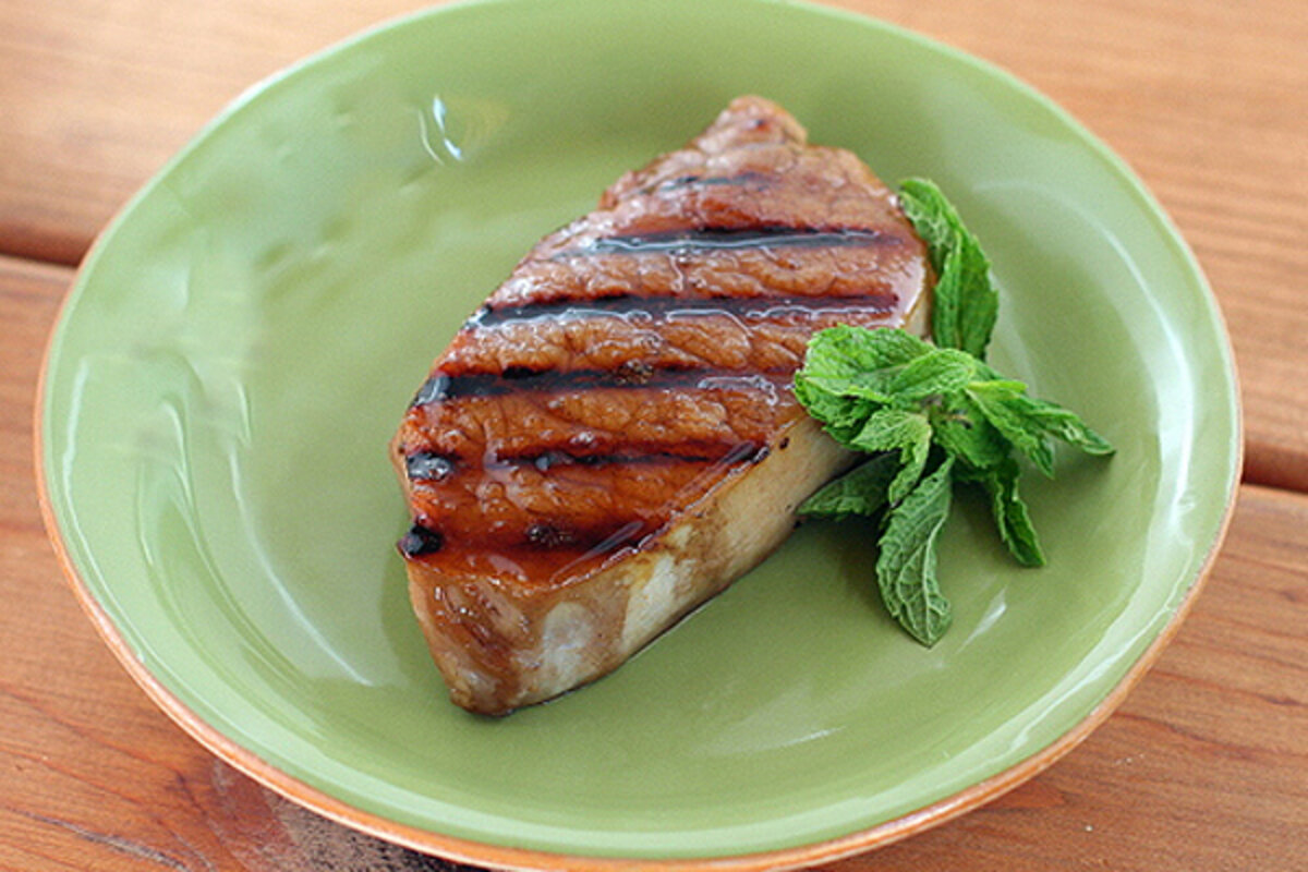 4. Lower the heat, over the grill and finish cooking the chops until cooked through, about 10 minutes, to an internal temperature of 145 degrees F. In the last few minutes of cooking, brush on a thick coat of glaze, then finish cooking. When the chops are done, brush with another coat of glaze, then remove to a platter. Tent with foil and let rest for 5 minutes.