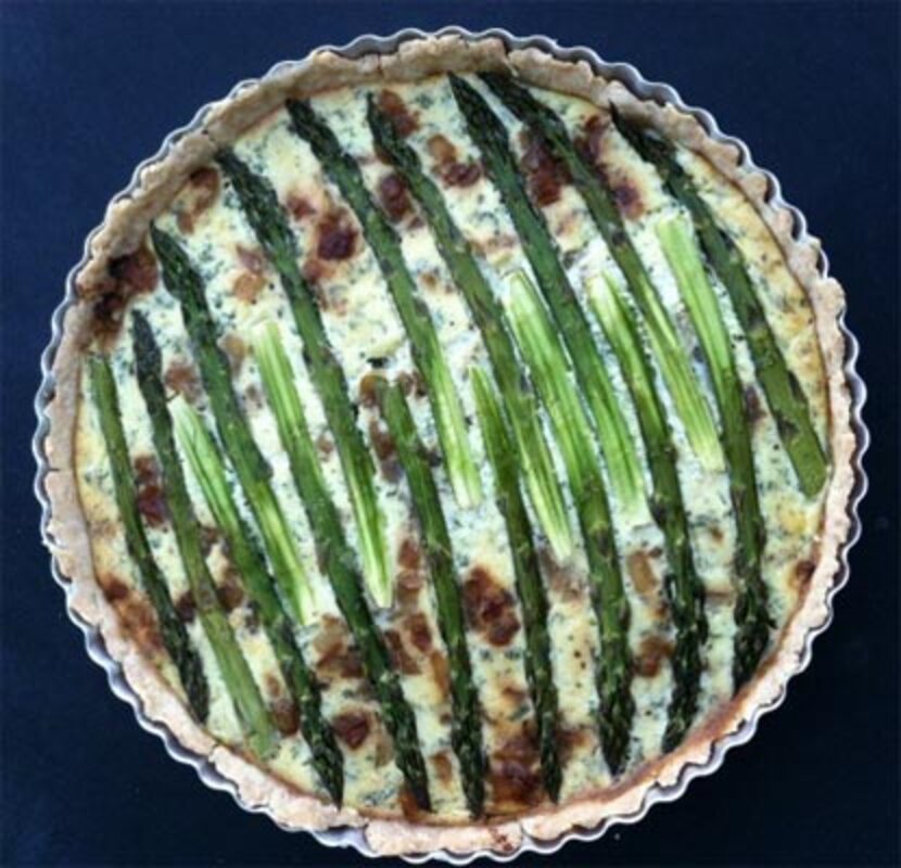 4. Vigorously stir together ricotta, cream, egg, lemon zest, parsley, salt and pepper.听 Pour into tart shell.听 Top ricotta mixture with caramelized onions, distributed evenly. Arrange asparagus spears on top of onion layer. Drizzle very lightly with olive oil.