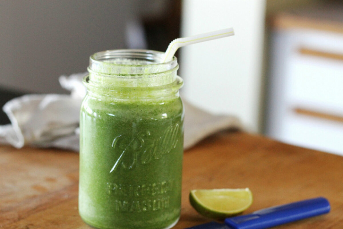 Into your blender, throw a giant handful of washed kale, some spinach if you have it, a couple stalks of celery with leaves, a big handful of frozen pineapple (or fresh pineapple plus a couple ice cubes), a wedge of lemon with the peel off, a knob of peeled ginger, and however much water you or your blender requires. My Vitamix just needs about 1/2 cup.听