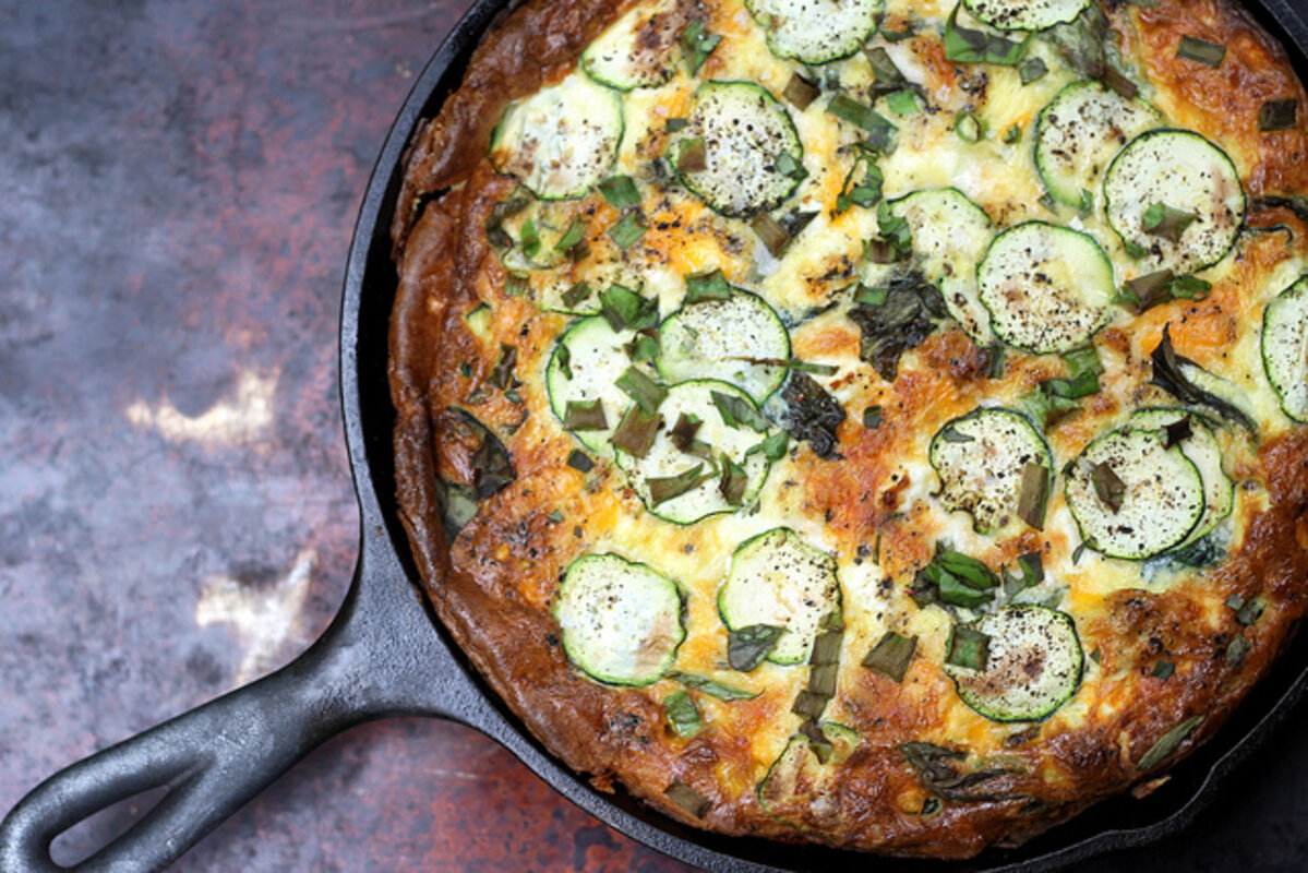3. In a medium bowl, whisk eggs, cream, and crushed tortilla chips together. Pour over saut茅ed veggies and let cook slowly for about 15 minutes, until it's starting to set up but not yet totally cooked. Top with cheese and herbs, and put into your preheated oven. Bake for about 10 minutes, until frittata is puffed and golden on top. Let cool for at least 15 minutes before you slice into wedges.