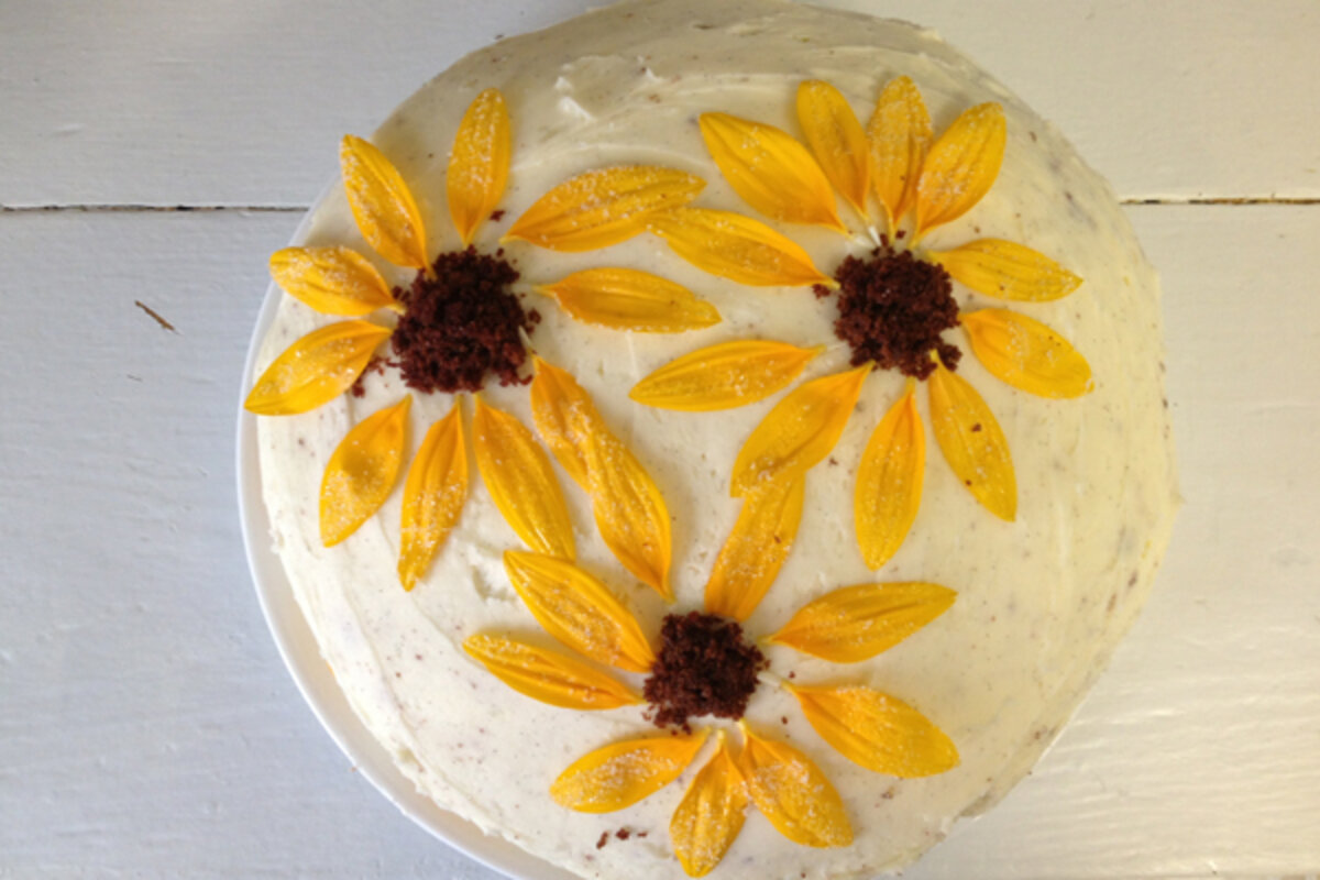 The next morning a moment of inspiration struck and I decided to use the leftover cake crumbs as the center of my "sunflowers" in the decorating process. Sunflower petals are 100 percent edible, and with a quick egg white wash and a sprinkle of sugar they were ready to go. While not quite as professional-looking as the decorated cake I made last year, I thought my sunflower topped-cake came out pretty darn cute (never mind that beneath all the frosting the cake was in about 20 pieces).