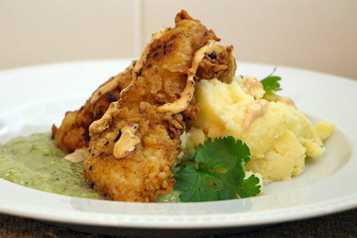 Gus Fring鈥檚 Los Pollos Hermanos Fried Chicken Tenders over Salsa Verde with Chipotle Drizzle